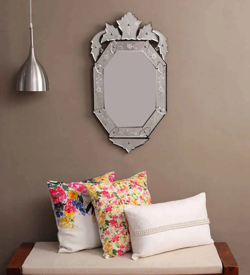 Feel like a Maharaja during grooming with the Prism Wall Mirror from Venetian Design. Made of durable MDF and glass material, this silver-coloured wall-mounted mirror is adorned with a beautiful design. This mirror measures 14 x 27 inches and can complement the stylish appeal of your home interiors.