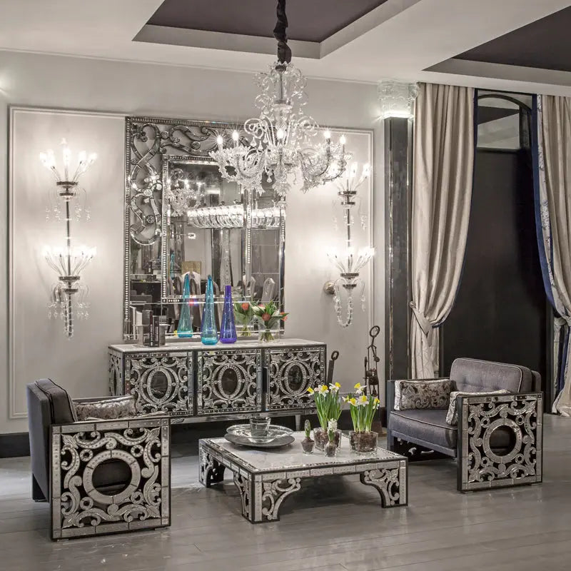 Overview : Introducing "Venetian Splendor" - an exquisite collection that effortlessly combines opulence, elegance, and the timeless allure of Venetian design. Inspired by the grandeur of the iconic city of Venice, this collection showcases the mesmerizing beauty of mirrored furniture, perfect for creating a captivating ambiance in your living room.